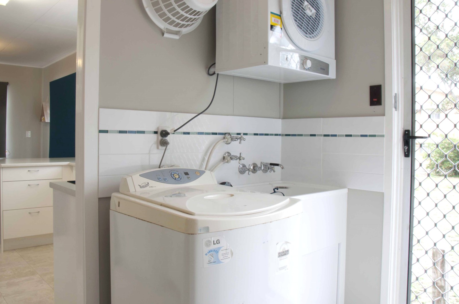 Both bedrooms have built in robes and pedestal fans. The main bedroom has a queen bed and the second bedroom has a double bed. The bathroom has a shower and vanity with a separate toilet. The laundry is equipped with both a washing machine and dryer.