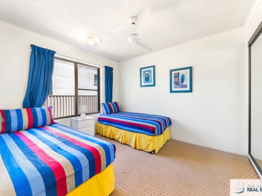 The master bedroom has a queen size bed, built in robe, ceiling fan and private access to the balcony. The second bedroom has two single beds, built in robes and a ceiling fan as well. The bathroom has a shower over the bath, vanity and separate toilet. There is a full laundry with a washing machine and dryer.
