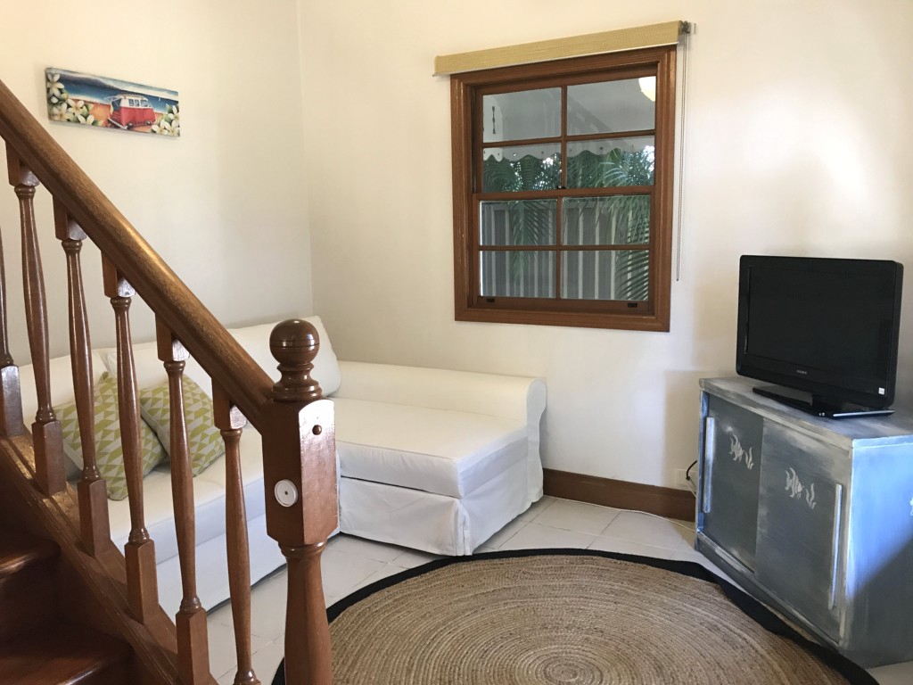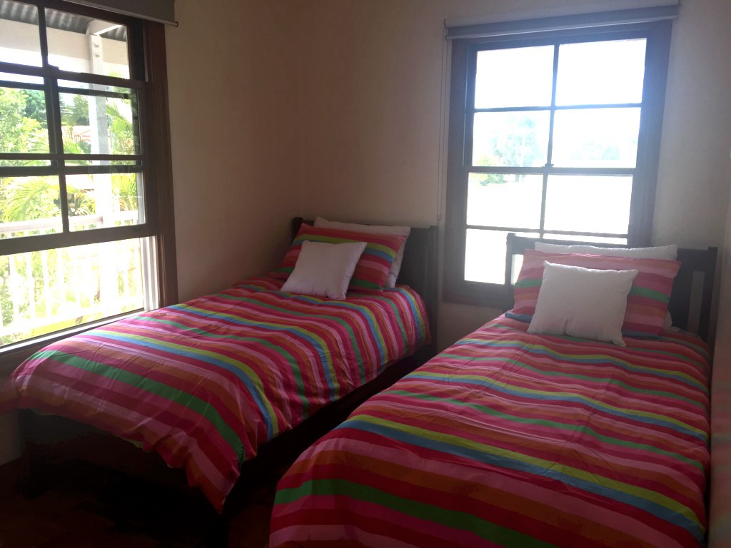 Upstairs there are four bedrooms, with two Queen beds (air conditioned) and three Single beds plus an extra mattress under one of the singles. There is also a smaller room off the master bedroom complete with portable cot for a baby. Downstairs there is a large living and dining area with a TV nook to one side and a formal lounge room with comfortable sofas. The second bathroom is downstairs and has a shower and toilet as well as a complete laundry with washer and dryer. The owners have provided lots to do with multiple books, toys, board games and push bikes for the families to share. The property is also located a short walk from the off leash dog beach and Woorim golf course, so there is entertainment to keep the whole family amused even the dog!