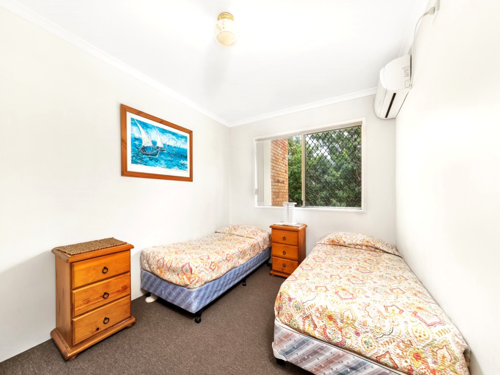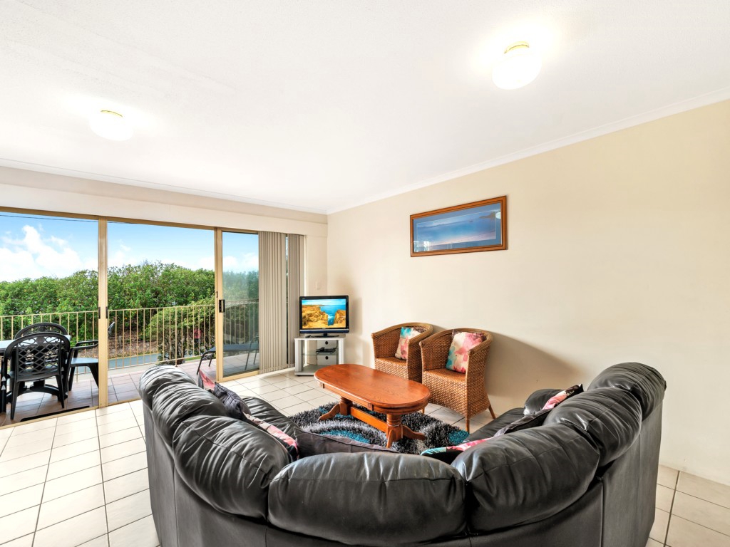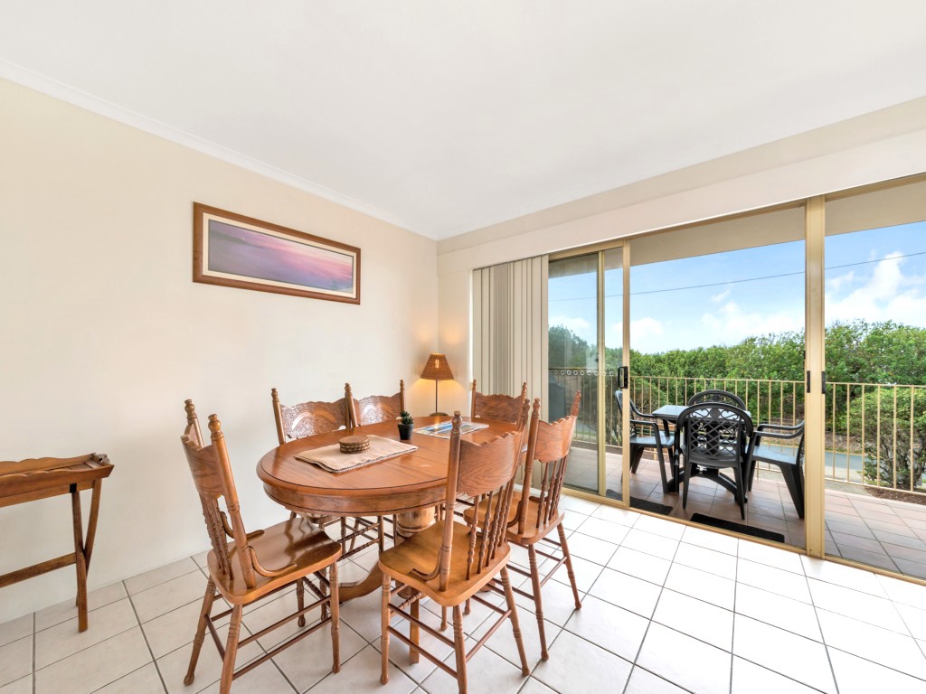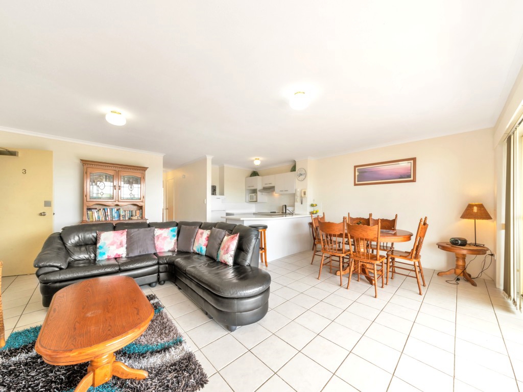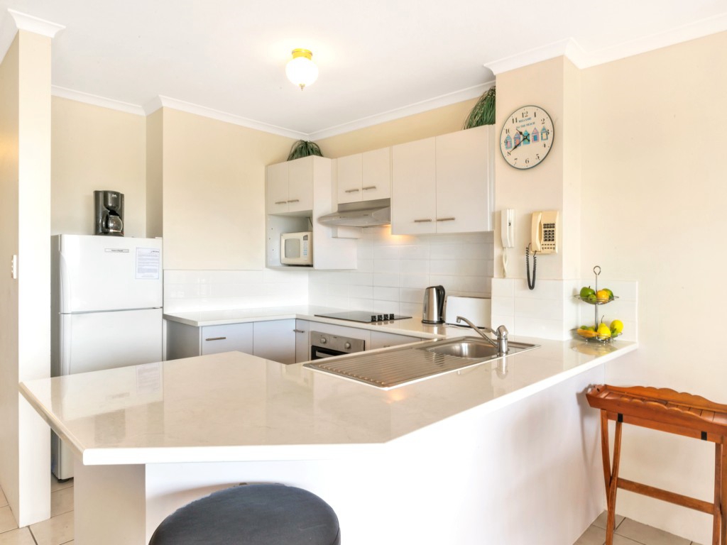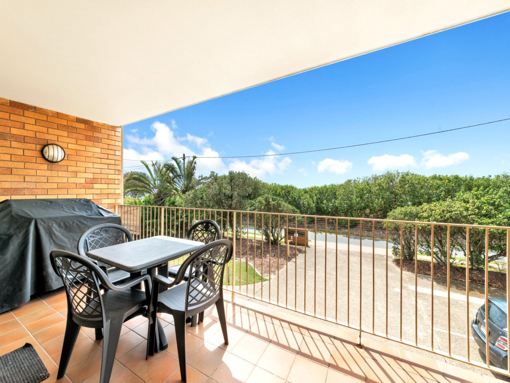 Refurbished 2 bedroom first floor apartment with huge balcony and water views. Right on the beach – walk across to the water. Airconditioning in both bedrooms, en suite to main. Beautifully appointed with cool tiles, spacious kitchen, dining and living areas, dishwasher, and full laundry facilities, 4 burner hooded BBQ on balcony. Good security with lock up garaging underneath. Walk to shops, hotel, club, etc.