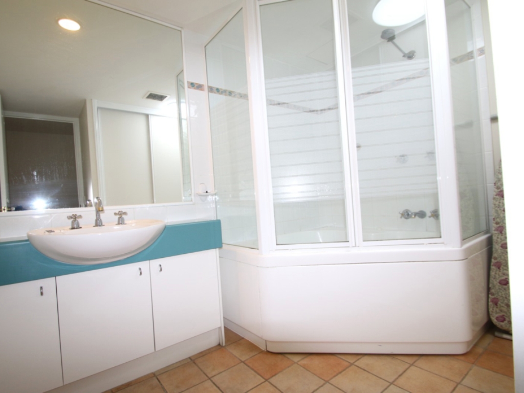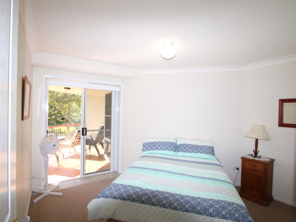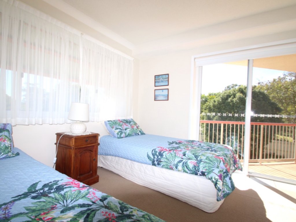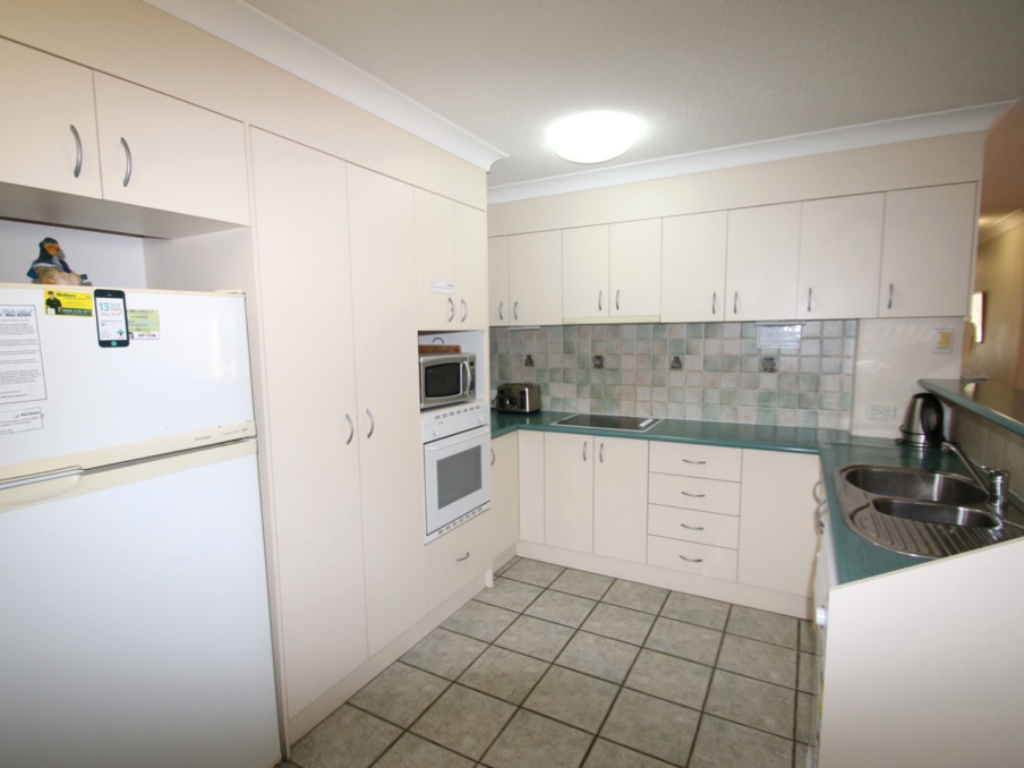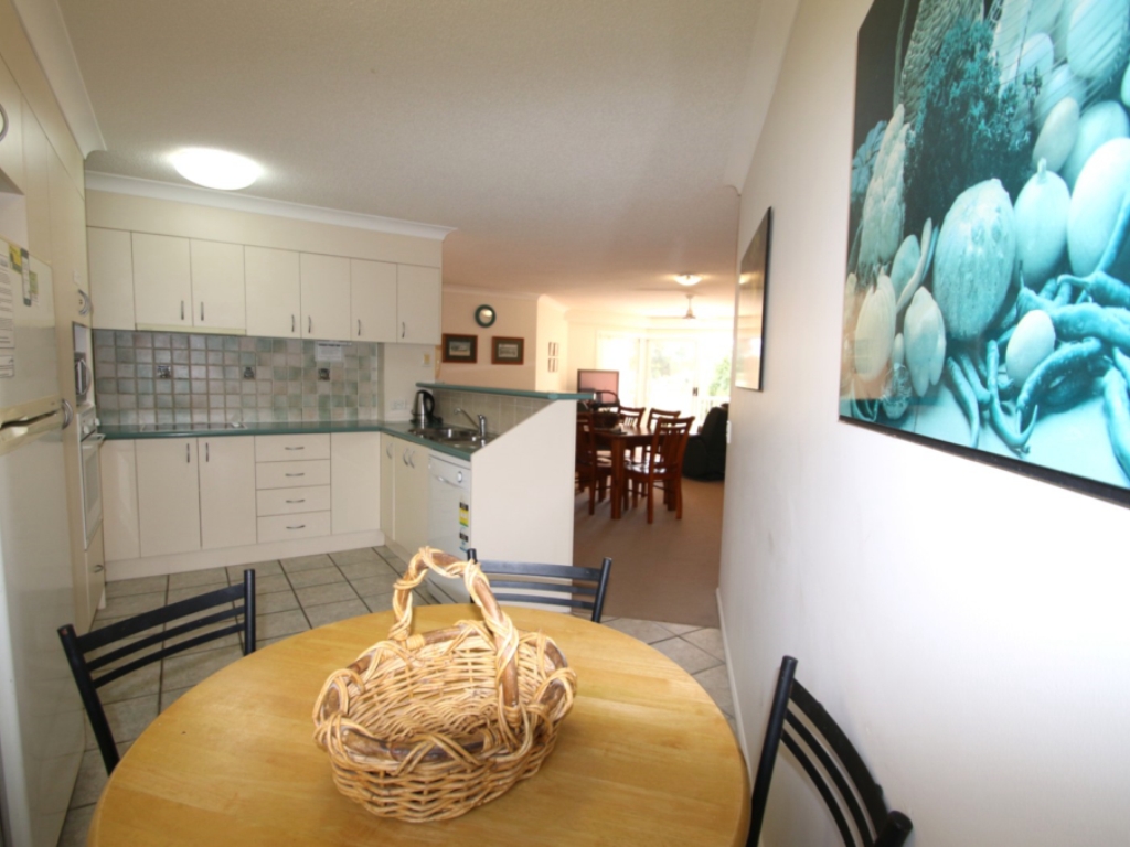 The main bedroom has a walk in robe and ensuite and is fitted with a queen size bed. The other two bedrooms have built in robes and private access out on to the balcony with views over the gold course. The second bedroom has a queen bed and the third bedroom has two single beds. They both share the main bathroom which has a spa bath, seperate toilet and complete laundry facilities.