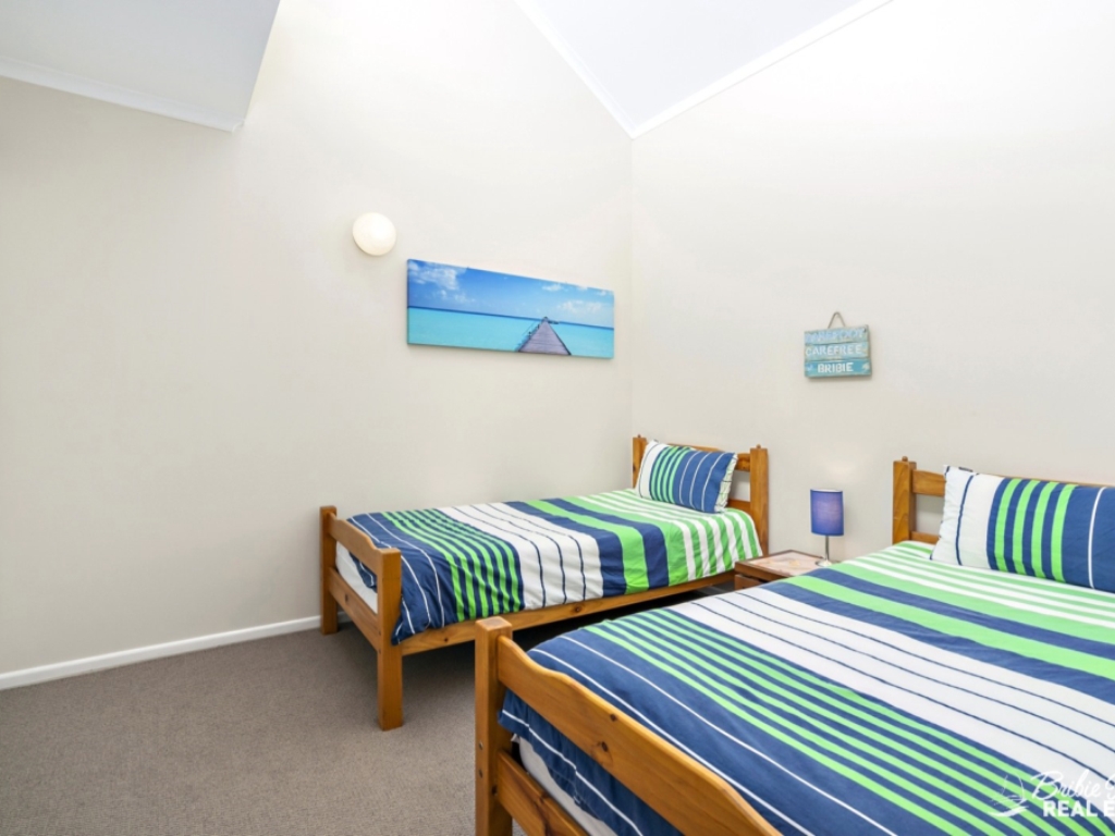 Upstairs you will find the open plan living, dining and kitchen area with lovely views over the communal area of the complex. The kitchen is well equipped for your stay and there are comfortable sofas surrounding the TV in the living room and a good-sized dining room table and chairs set to host a family dinner. There is also the master bedroom with a queen size bed, ceiling fan, built in robe and private access to the balcony which is set up with seating. This balcony is the perfect spot to sit back and enjoy some quiet time with a book. The third bedroom is also upstairs and has two single beds, a built-in robe and pedestal fan. The second bathroom has a shower and bath combo, vanity and separate toilet.