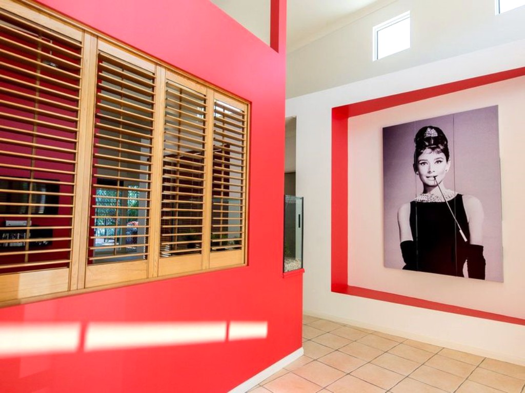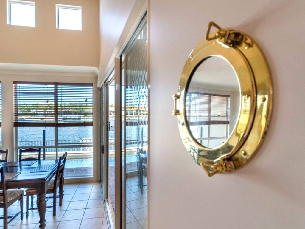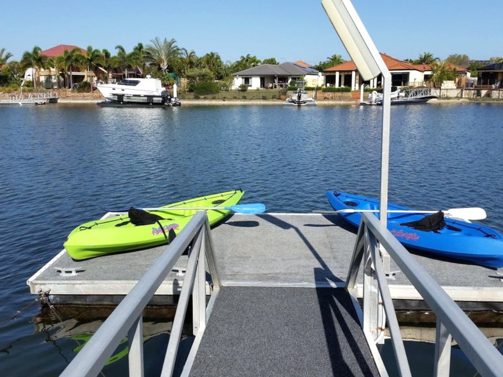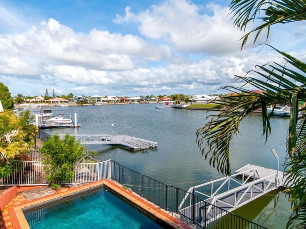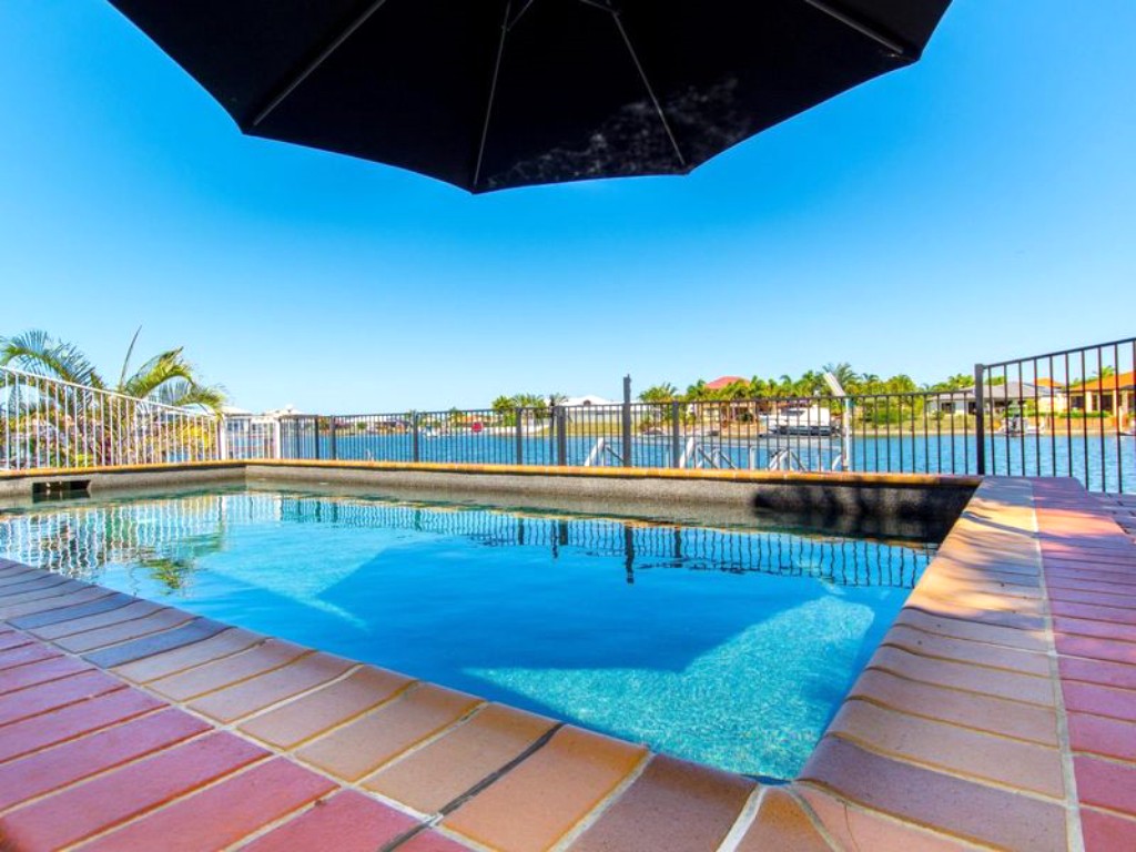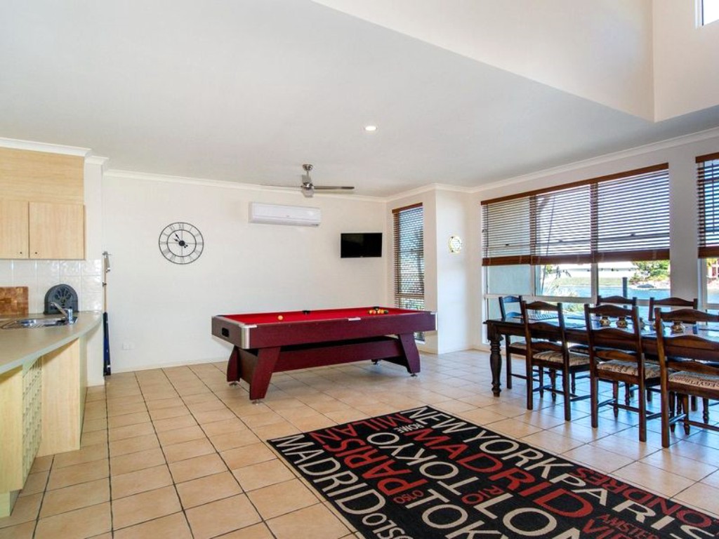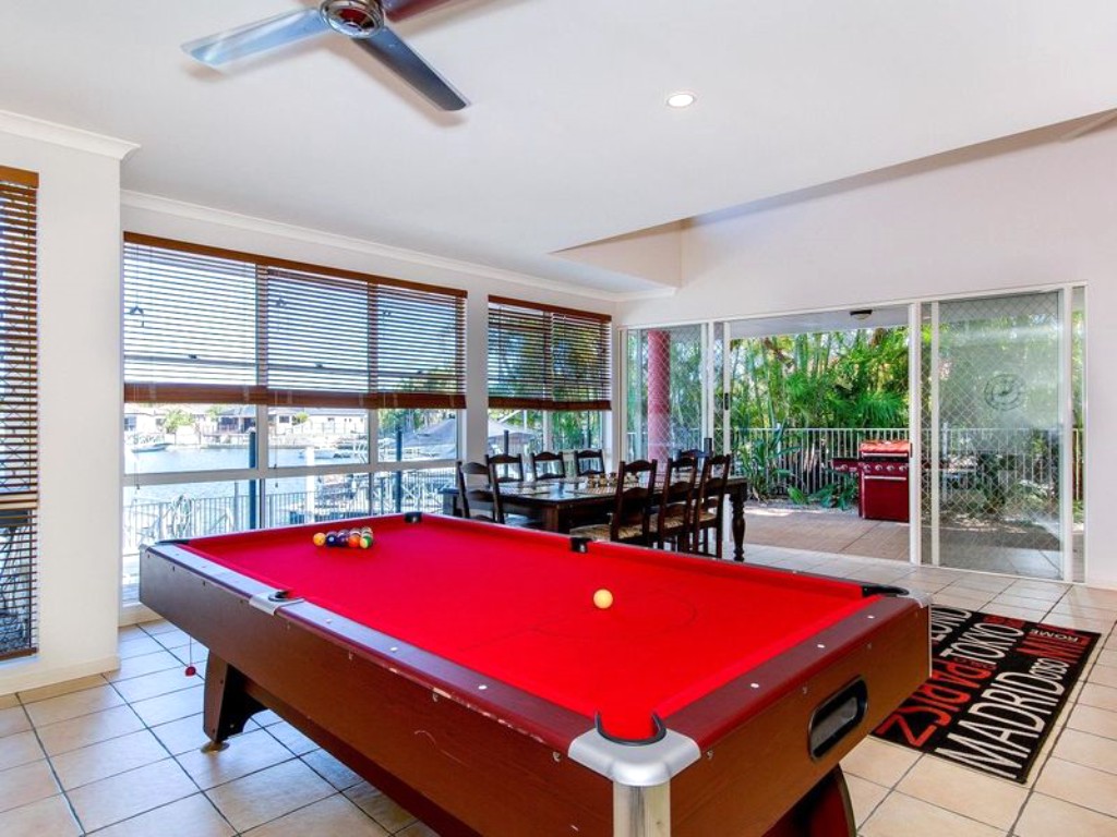 The living room off the kitchen has a pool table TV and dining room table. This area flows out to the undercover entertaining area that over looks the canal and swimming pool. The outdoor area has an out-door table and chairs setting and a BBQ. It’s a great place to enjoy a family meal or just relax soaking up the views.