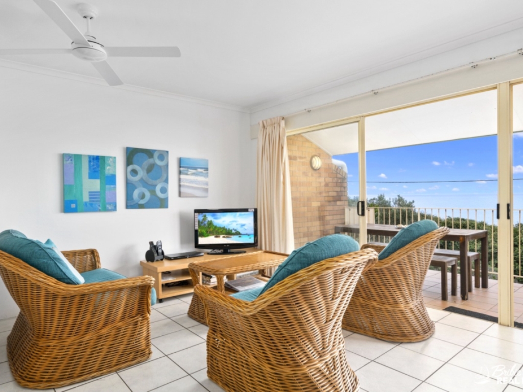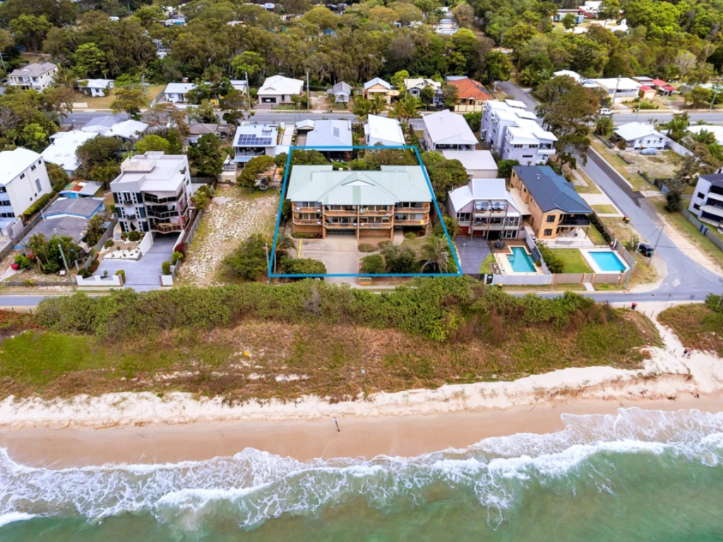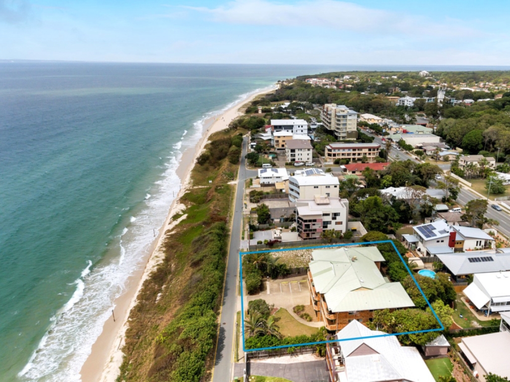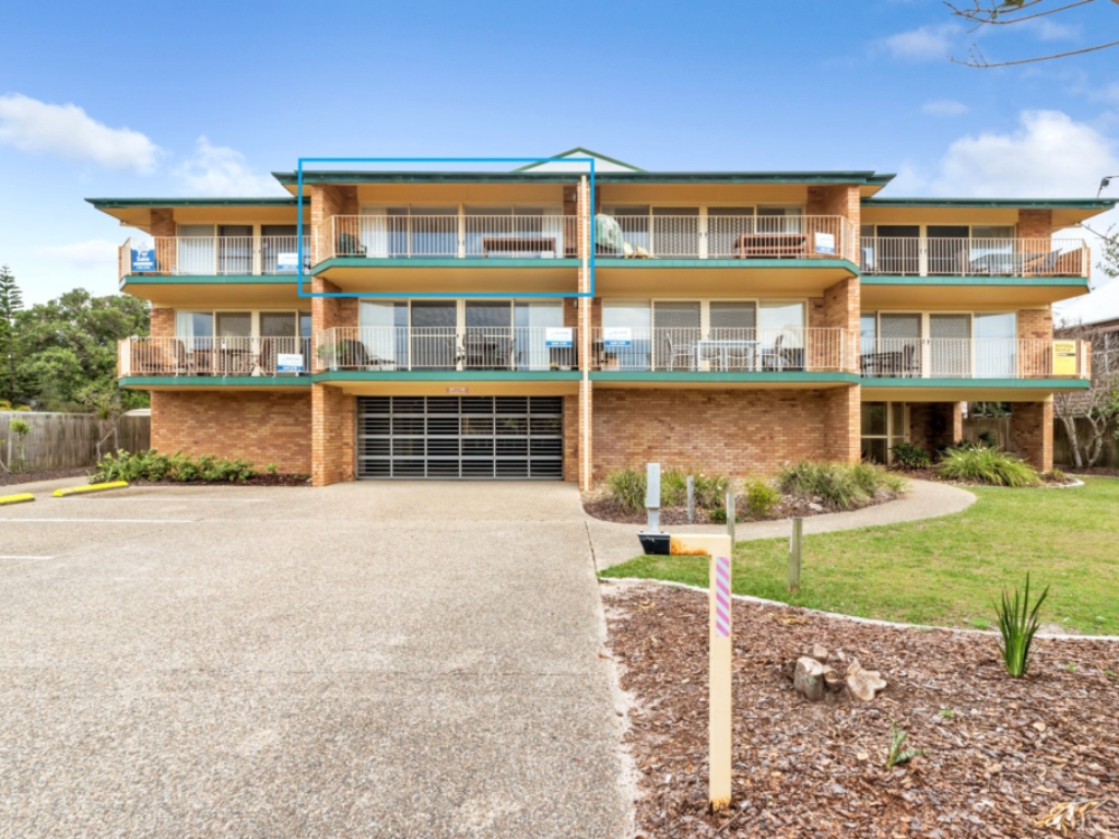This top floor beachfront apartment offers its guests stunning ocean views, two steps to the sand and two minutes’ walk to the centre of town. The unit is in the sort after complex of Moreton Terraces and being set on the top floor offers undisturbed ocean views over to Moreton Island and if you’re lucky you may even see the dolphins and whales passing by.