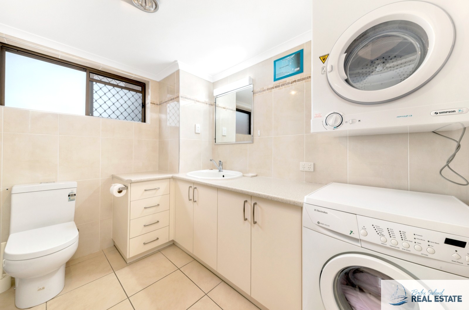The main bedroom has a queen size bed and a TV and the second bedroom has two single beds. Both bedrooms have built in robes and ceiling fans. Linen is included at this property so you only need to bring your personal belongings and a beach/pool towel. The bathroom and laundry are combined and have been tastefully refurbished.