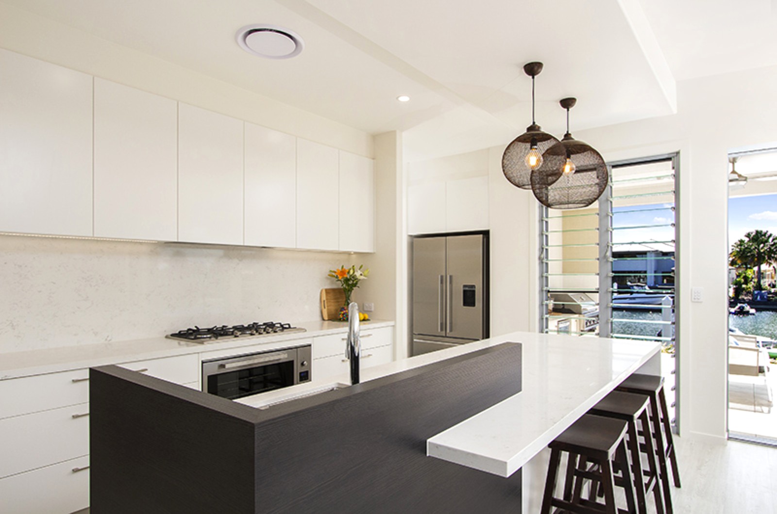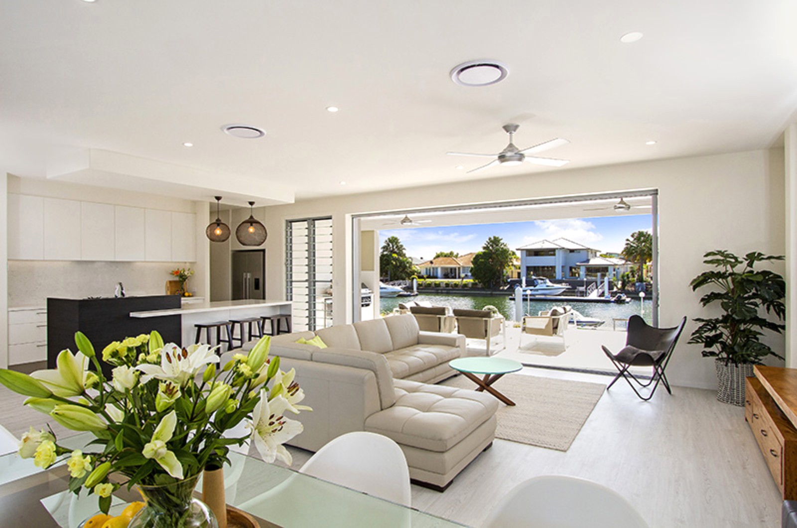 With a cavity stacker glass door that disappears into the wall, it’s hard to tell where the indoor space ends & the outdoors begins. The open plan concept here includes an indoor Lounge, dining, kitchen area which flow seamlessly on both sides to outdoor entertaining areas. Canal views & outdoor kitchen one side, pool with decks on the other. Add a bench seat right by the water, & a lower deck, perfect for morning coffees & you are spoilt for choice. Please note that the pools water feature is not accessible by guests.