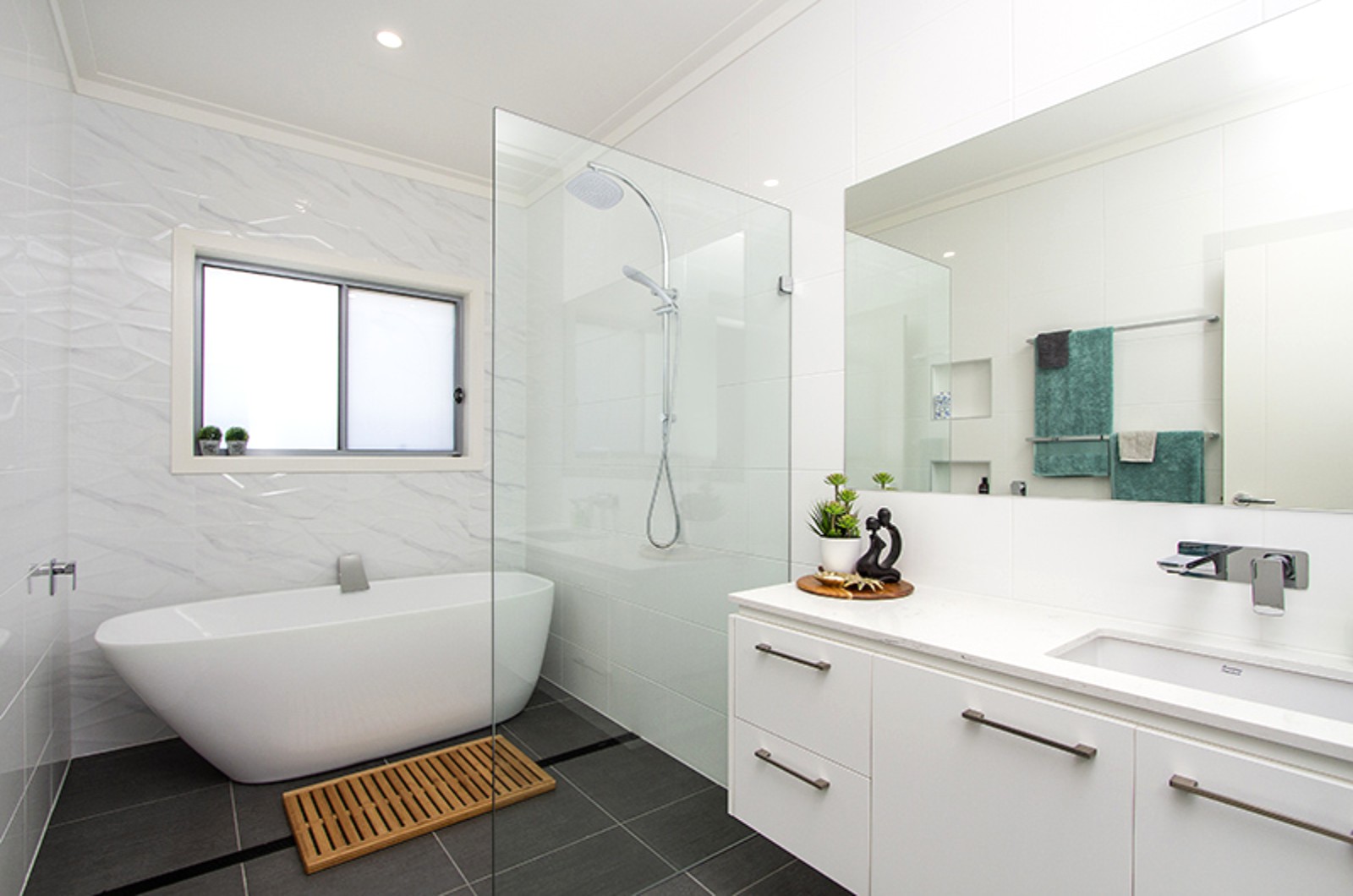 The third & fourth bedrooms are positioned either side of a master bathroom, which features a gorgeous wet area complete with a huge soaker tub.